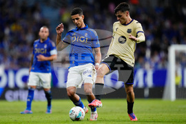 Barcelona's Marc Casado fights for the ball against Real Oviedo's Salomon Rondon during a Spanish La Liga soccer match at the Carlos Tartiere stadium in Oviedo, Spain, Thursday, Sept. 25, 2025. (AP Photo/Jose Breton)