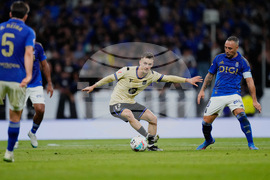 Barcelona's Frenkie de Jong runs for the ball during a Spanish La Liga soccer match at the Carlos Tartiere stadium in Oviedo, Spain, Thursday, Sept. 25, 2025. (AP Photo/Jose Breton)