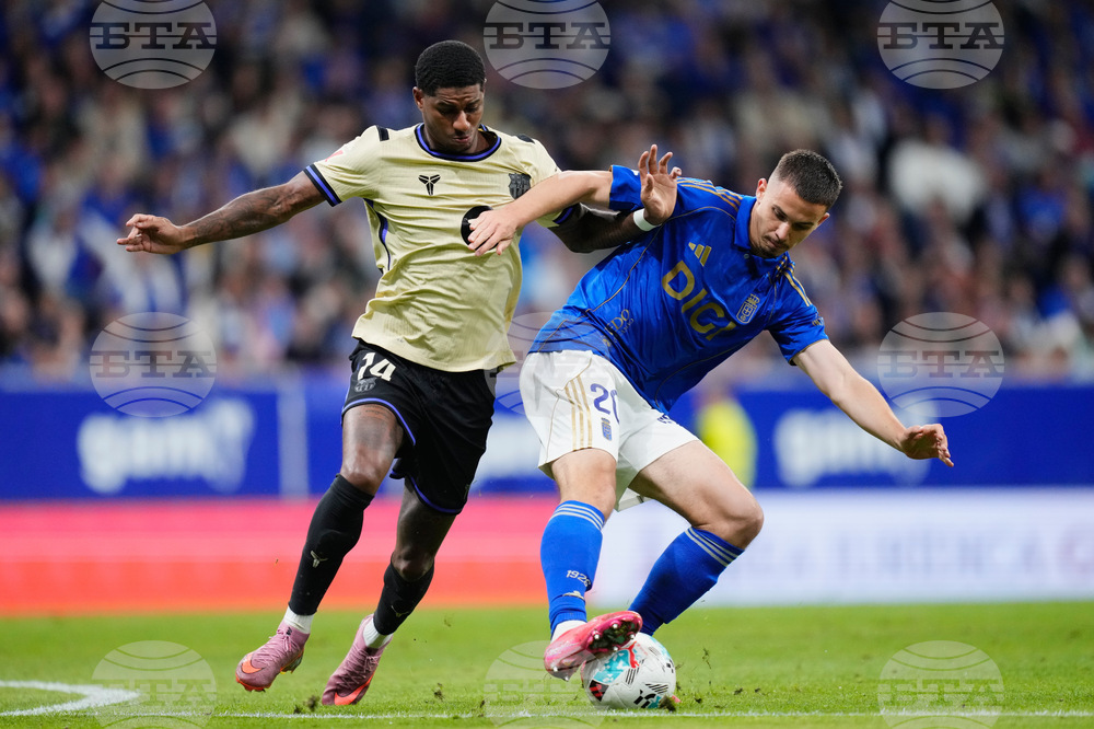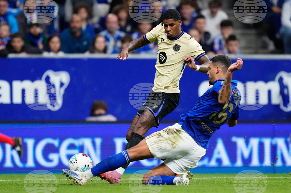 Barcelona's Marcus Rashford fights for the ball against Real Oviedo's David Carmo during a Spanish La Liga soccer match at the Carlos Tartiere stadium in Oviedo, Spain, Thursday, Sept. 25, 2025. (AP Photo/Jose Breton)