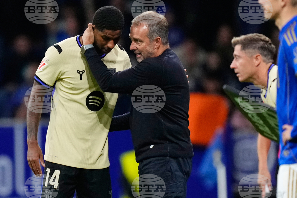 Barcelona's head coach Hansi Flick speaks with Marcus Rashford during a Spanish La Liga soccer match at the Carlos Tartiere stadium in Oviedo, Spain, Thursday, Sept. 25, 2025. (AP Photo/Jose Breton)