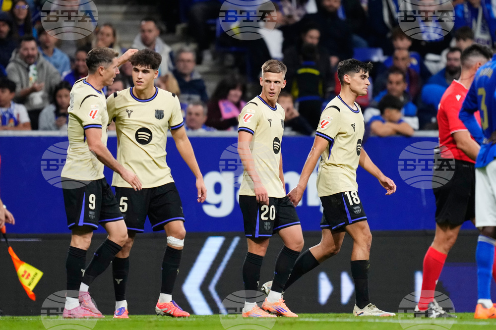 Barcelona's Robert Lewandowski celebrates his side's second goal during a Spanish La Liga soccer match at the Carlos Tartiere stadium in Oviedo, Spain, Thursday, Sept. 25, 2025. (AP Photo/Jose Breton)
