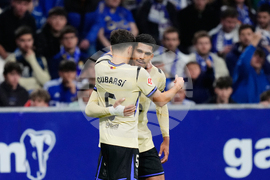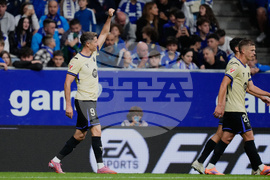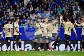 Barcelona's Eric Garcia celebrates with team mates his side's first goal during a Spanish La Liga soccer match at the Carlos Tartiere stadium in Oviedo, Spain, Thursday, Sept. 25, 2025. (AP Photo/Jose Breton)
