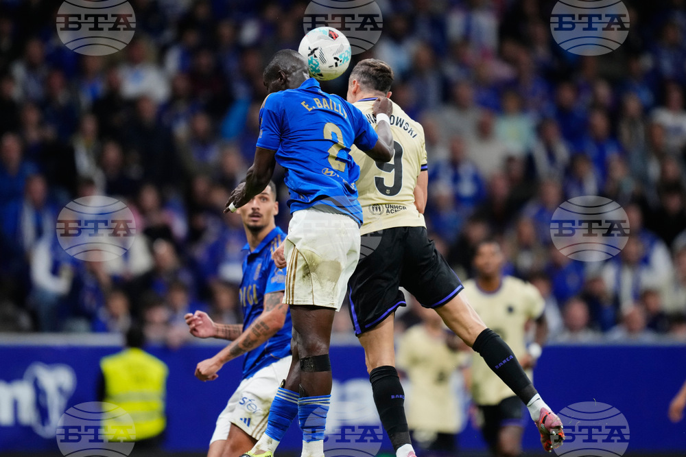 Barcelona's Robert Lewandowski fights for the ball against Real Oviedo's Eric Bailly during a Spanish La Liga soccer match at the Carlos Tartiere stadium in Oviedo, Spain, Thursday, Sept. 25, 2025. (AP Photo/Jose Breton)