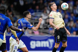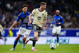 Barcelona's Robert Lewandowski fights for the ball against Real Oviedo's Lucas Ahijado during a Spanish La Liga soccer match at the Carlos Tartiere stadium in Oviedo, Spain, Thursday, Sept. 25, 2025. (AP Photo/Jose Breton)