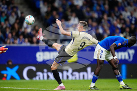 Barcelona's Robert Lewandowski scores his side's second goal during a Spanish La Liga soccer match at the Carlos Tartiere stadium in Oviedo, Spain, Thursday, Sept. 25, 2025. (AP Photo/Jose Breton)