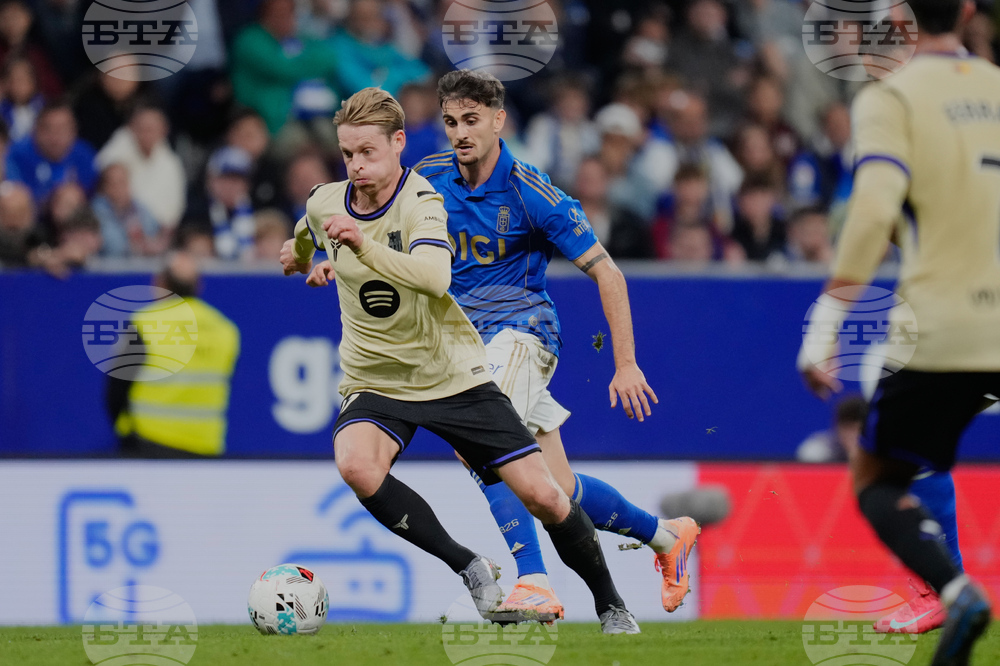 Barcelona's Frenkie de Jong fights runs for the ball during a Spanish La Liga soccer match at the Carlos Tartiere stadium in Oviedo, Spain, Thursday, Sept. 25, 2025. (AP Photo/Jose Breton)