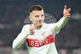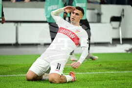 VfB Stuttgart's Badredine Bouanani celebrates scoring a goal during the Europa League soccer match between VfB Stuttgart and Celta Vigo at MHPArena in Stuttgart, Germany, Thursday, Sept. 25, 2025. (Bernd Weissbrod/dpa via AP)