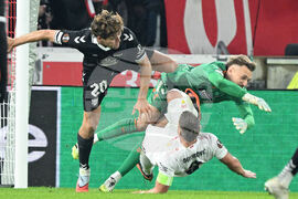 Celta Vigo's Marcos Alonso, left, and goalkeeper Ionut Radu collide with VfB Stuttgart's Ermedin Demirovic during the Europa League soccer match between VfB Stuttgart and Celta Vigo at MHPArena in Stuttgart, Germany, Thursday, Sept. 25, 2025. (Bernd Weissbrod/dpa via AP)