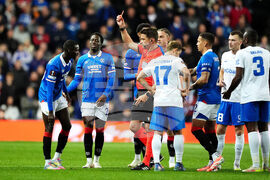 Rangers' Mohammed Diomande, left, is shown a red card by referee Matej Jug during the Europa League, soccer match against Genk at Ibrox Stadium in Glasgow, Scotland, Thursday, Sept. 25, 2025. (Andrew Milligan/PA via AP)