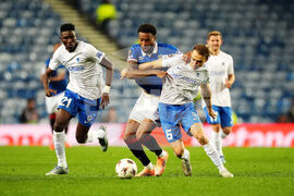Rangers' Youssef Chermiti, center, and Genk's Matte Smets battle for the ball during a Europa League soccer match at Ibrox Stadium in Glasgow, Scotland, Thursday, Sept. 25, 2025. (Andrew Milligan/PA via AP)