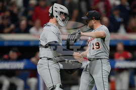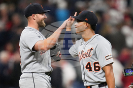 Detroit Tigers catcher Dillon Dingler, left, celebrates with relief pitcher Will Vest (19) after the Tigers defeated the Cleveland Guardians in a baseball game in Cleveland, Thursday, Sept. 25, 2025. (AP Photo/Sue Ogrocki)