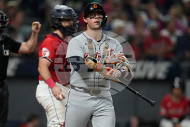 Cleveland Guardians' Jose Ramirez, right, and Detroit Tigers catcher Dillon Dingler, left, watch Ramirez's RBI double in the eighth inning of a baseball game in Cleveland, Thursday, Sept. 25, 2025. (AP Photo/Sue Ogrocki)