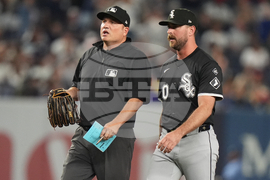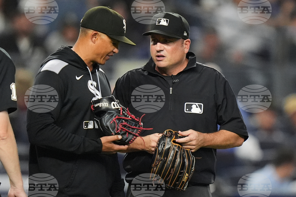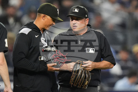 Umpire Dan Bellino holds the glove of Chicago White Sox pitcher Tyler Gilbert before he pitches during the fifth inning of a baseball game against the New York Yankees Thursday, Sept. 25, 2025, in New York. (AP Photo/Frank Franklin II)