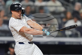 New York Yankees' Giancarlo Stanton follows through on a three-run double during the fifth inning of a baseball game against the Chicago White Sox Thursday, Sept. 25, 2025, in New York. (AP Photo/Frank Franklin II)