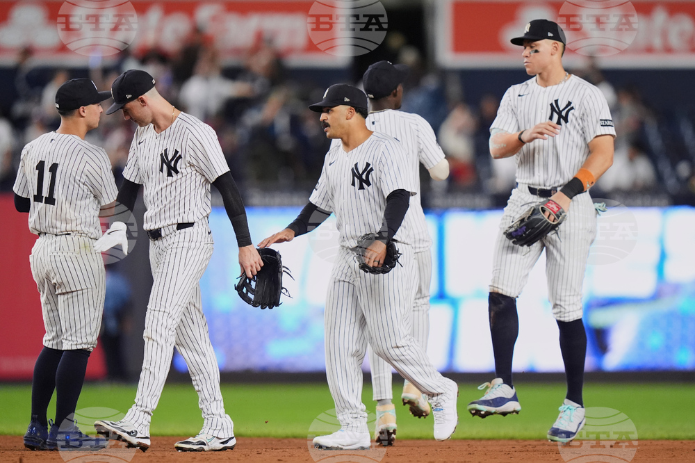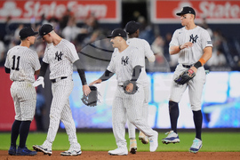 New York Yankees' Anthony Volpe, left, and Aaron Judge celebrates with teammates after a baseball game against the Chicago White Sox Thursday, Sept. 25, 2025, in New York. (AP Photo/Frank Franklin II)