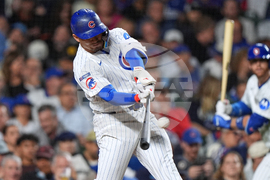 Chicago Cubs' Seiya Suzuki, of Japan, hits a solo home run during the fourth inning of a baseball game against the New York Mets in Chicago, Thursday, Sept. 25, 2025. (AP Photo/Nam Y. Huh)