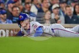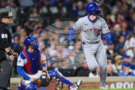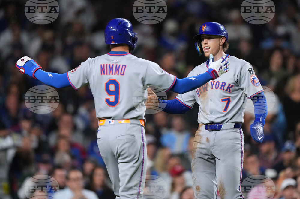 New York Mets' Brett Batyscores on a two-run double by Tyrone Taylor during the sixth inning of a baseball game against the Chicago Cubs in Chicago, Thursday, Sept. 25, 2025. (AP Photo/Nam Y. Huh)