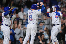 Chicago Cubs' Seiya Suzuki, right, of Japan, celebrates with Ian Happ (8) and Moisés Ballesteros after hitting a three-run home run during the sixth inning of a baseball game against the New York Mets in Chicago, Thursday, Sept. 25, 2025. (AP Photo/Nam Y. Huh)