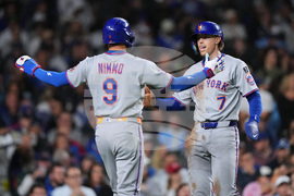New York Mets' Brett Baty, right, celebrates with New Brandon Nimmo after scoring on a two-run double by Tyrone Taylor during the sixth inning of a baseball game against the Chicago Cubs in Chicago, Thursday, Sept. 25, 2025. (AP Photo/Nam Y. Huh)