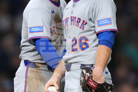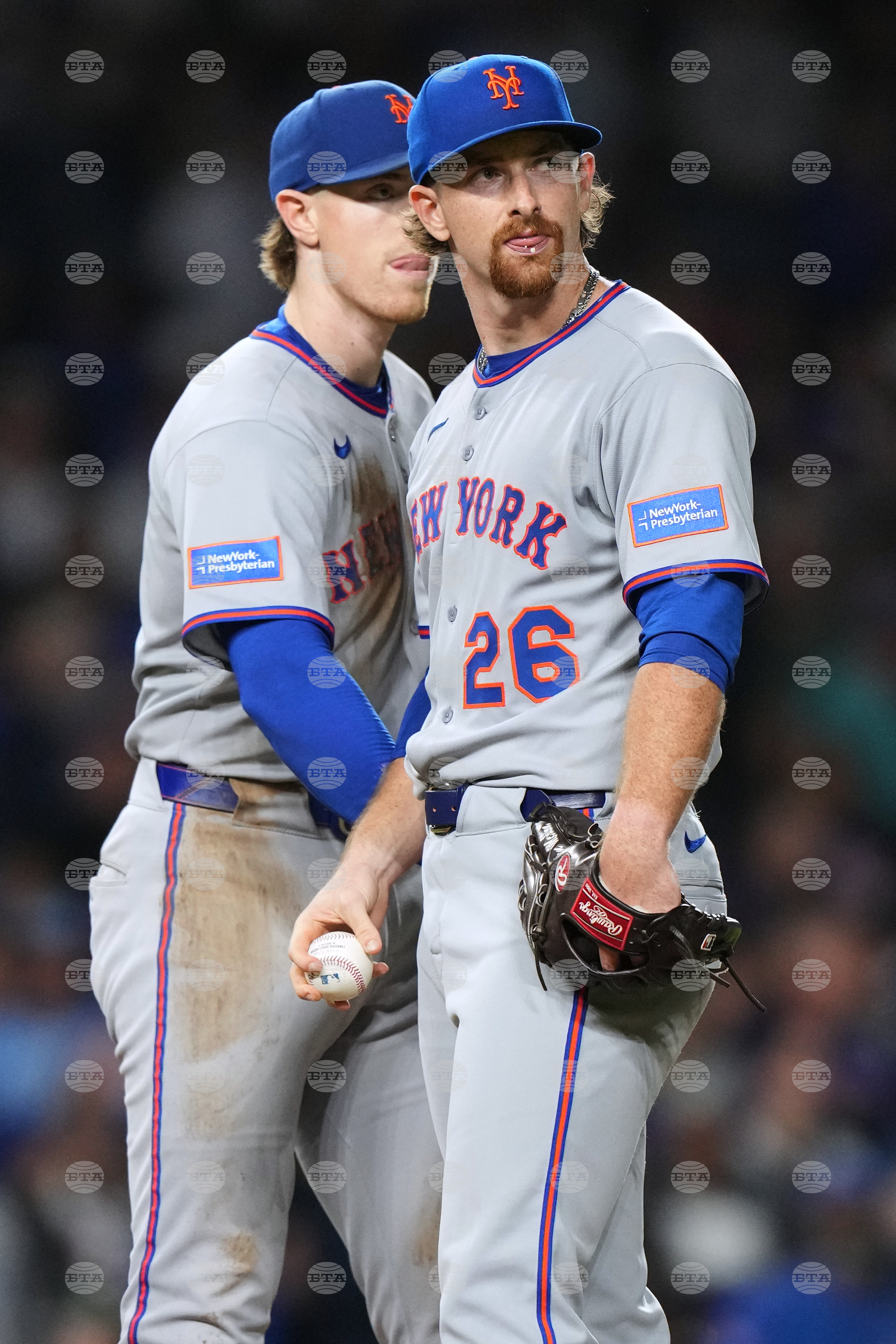 New York Mets starting pitcher Nolan McLean, right, and third baseman Brett Baty react as they look at the scoreboard after Chicago Cubs' Seiya Suzuki, of Japan, hit a three-run home run during the sixth inning of a baseball game in Chicago, Thursday, Sept. 25, 2025. (AP Photo/Nam Y. Huh)