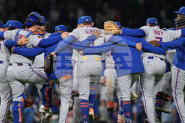 New York Mets players celebrate after defeating the Chicago Cubs in a baseball game in Chicago, Thursday, Sept. 25, 2025. (AP Photo/Nam Y. Huh)