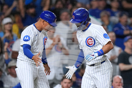 Chicago Cubs' Seiya Suzuki (27), of Japan, is congratulated by manager Craig Counsell, right, after hitting a solo home run during the fourth inning of a baseball game against the New York Mets in Chicago, Thursday, Sept. 25, 2025. (AP Photo/Nam Y. Huh)