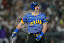 Seattle Mariners' Julio Rodriguez reacts after grounding out during the fourth inning of a baseball game against the Colorado Rockies, Thursday, Sept. 25, 2025, in Seattle. (AP Photo/Ryan Sun)