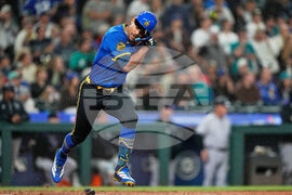 Seattle Mariners center fielder Julio Rodriguez catches a fly out by Colorado Rockies' Mickey Moniak during the third inning of a baseball game, Thursday, Sept. 25, 2025, in Seattle. (AP Photo/Ryan Sun)