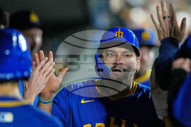 Seattle Mariners' Josh Naylor celebrates in the dugout after scoring off a single hit by Eugenio Suarez during the fifth inning of a baseball game against the Colorado Rockies, Thursday, Sept. 25, 2025, in Seattle. (AP Photo/Ryan Sun)
