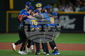 The Seattle Mariners celebrate after the team's win against the Colorado Rockies in a baseball game, Thursday, Sept. 25, 2025, in Seattle. (AP Photo/Ryan Sun)