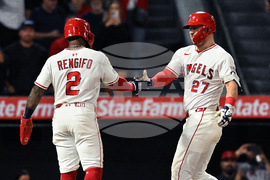 Los Angeles Angels outfielder Mike Trout (27) celebrates his two-run home run with teammate Luis Rengifo (2) against the Kansas City Royals in the eighth inning of a baseball game Thursday, Sept. 25, 2025, in Anaheim, Calif. (AP Photo/Wally Skalij)