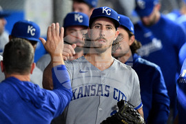 Kansas City Royals pitcher Michael Lorenzen walks through the dugout after coming out of the game against the Los Angeles Angels in the sixth inning of a baseball game Thursday, Sept. 25, 2025, in Anaheim, Calif. (AP Photo/Wally Skalij)
