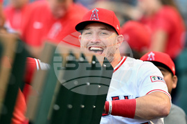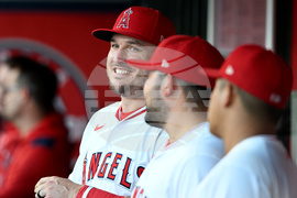 Los Angeles Angels outfielder Mike Trout smiles before a baseball game against the Kansas City Royals Thursday, Sept. 25, 2025, in Anaheim, Calif. (AP Photo/Wally Skalij)