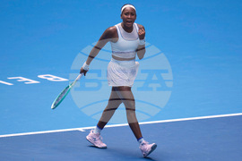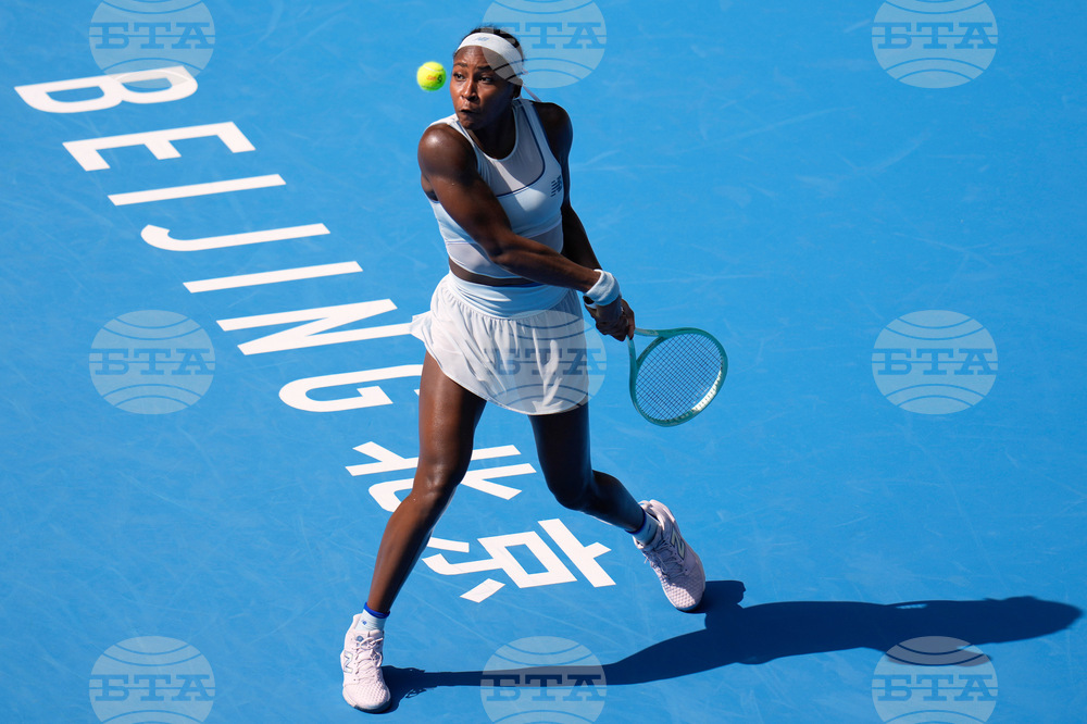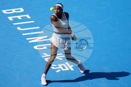 Coco Gauff of the United States returns a shot from Kamilla Rakhimova during a women's singles match of the China Open tennis tournament in Beijing, China, Friday, Sept. 26, 2025. (AP Photo/Ng Han Guan)