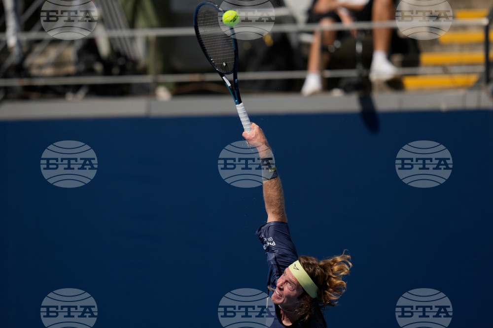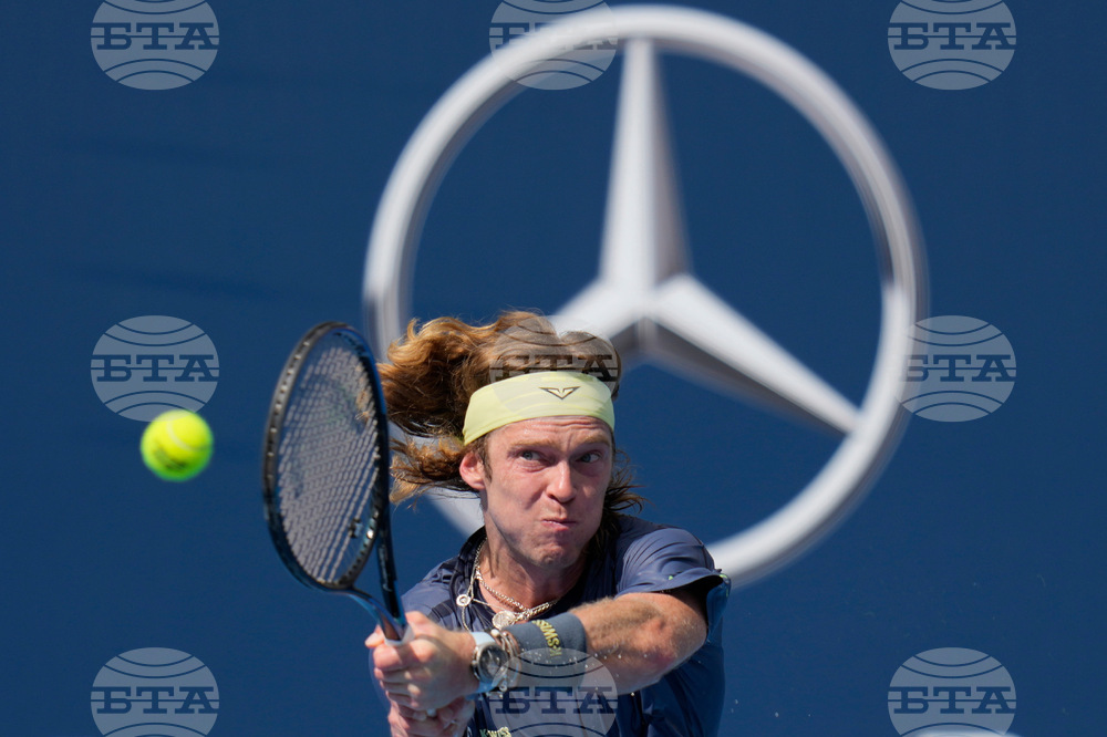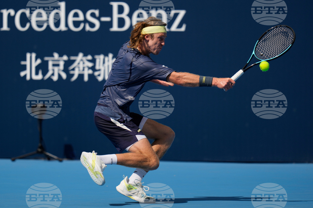 Andrey Rublev returns a shot from Flavio Cobolli of Itay in a men's singles match for the China Open tennis tournament in Beijing, China, Friday, Sept. 26, 2025. (AP Photo/Ng Han Guan)