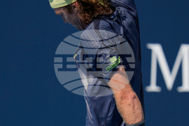 Andrey Rublev reacts after losing to Flavio Cobolli of Itay in a men's singles match for the China Open tennis tournament in Beijing, China, Friday, Sept. 26, 2025. (AP Photo/Ng Han Guan)