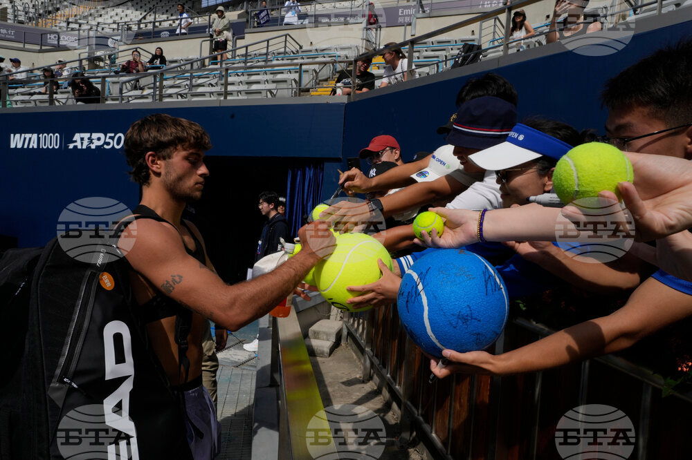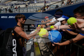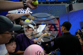 Flavio Cobolli of Itay autographs for fans after defeating Andrey Rublev in a men's singles match for the China Open tennis tournament in Beijing, China, Friday, Sept. 26, 2025. (AP Photo/Ng Han Guan)