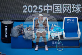 Yuan Yue, of China wipes sweat as she preparing to serve against Iga Swiatek, of Poland during the women's singles match for the China Open tennis tournament, at the National Tennis Center, in Beijing, Saturday, Sept. 27, 2025. (AP Photo/Andy Wong)