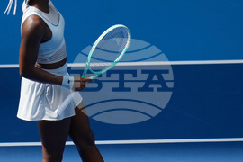 Coco Gauff of the United States reacts during a play against Kamilla Rakhimova in a women's singles match of the China Open tennis tournament in Beijing, China, Friday, Sept. 26, 2025. (AP Photo/Ng Han Guan)