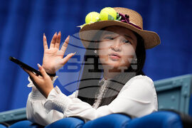 A tennis fan wearing a hat with tennis balls reacts during a men's singles match between Bu Yunchaokete of China and Alex De Minaur of Australia during the China Open tennis tournament in Beijing, China, Friday, Sept. 26, 2025. (AP Photo/Ng Han Guan)