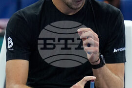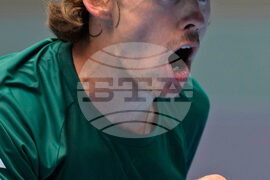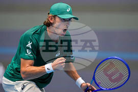 Alex De Minaur of Australia reacts during play against Bu Yunchaokete of China in a men's singles match for the China Open tennis tournament in Beijing, China, Friday, Sept. 26, 2025. (AP Photo/Ng Han Guan)