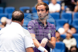 Daniil Medvedev reacts to the referee before play against Cameron Norrie of Great Britain in a men's singles match for the China Open tennis tournament in Beijing, China, Friday, Sept. 26, 2025. (AP Photo/Ng Han Guan)