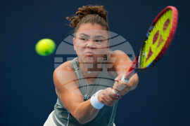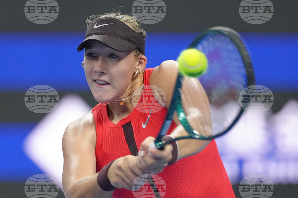 Amanda Anisimova of the United States returns a shot from Katie Boulter of Great Britain in a women's singles match for the China Open tennis tournament in Beijing, China, Friday, Sept. 26, 2025. (AP Photo/Ng Han Guan)