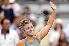 Jasmine Paolini of Italy reacts after defeating Anastasija Sevastova of Latvia in a women's singles match for the China Open tennis tournament in Beijing, China, Friday, Sept. 26, 2025. (AP Photo/Ng Han Guan)