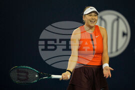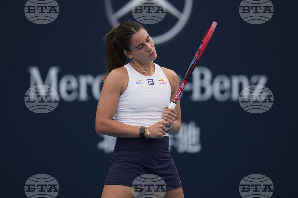 Emma Navarro, of the United States reacts as she plays against Elena-Gabriela Ruse, of Romania during the women's singles match for the China Open tennis tournament, at the National Tennis Center, in Beijing, Saturday, Sept. 27, 2025. (AP Photo/Andy Wong)