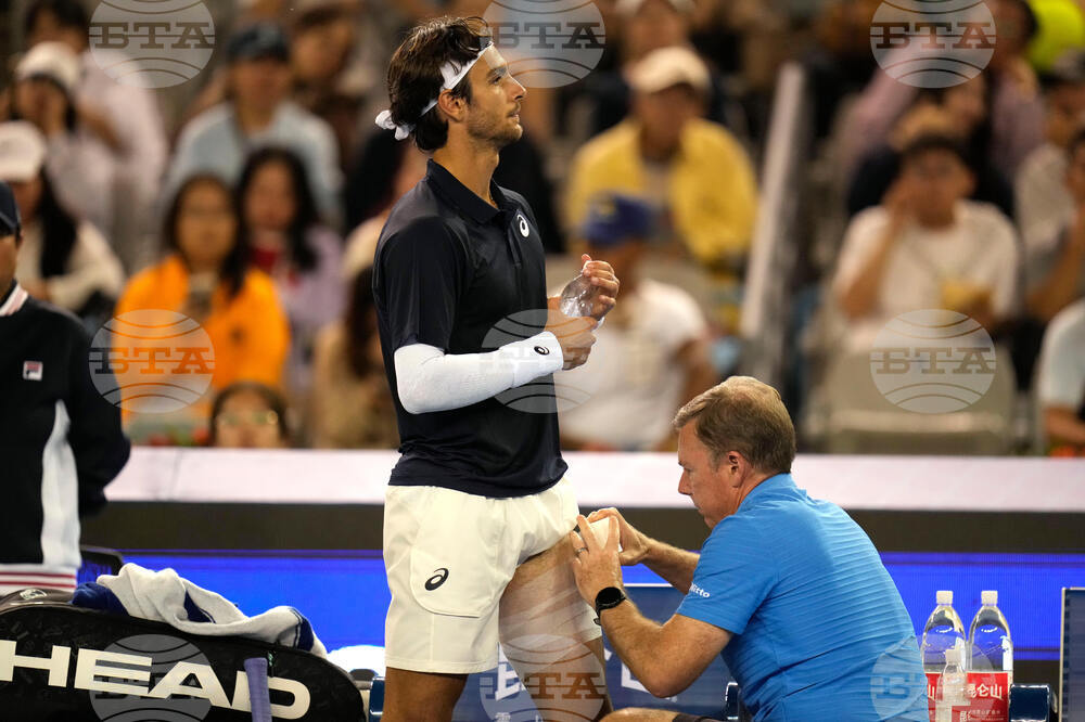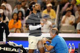 Lorenzo Musetti of Italy gets medical attention during play against Giovanni Mpetshi Perricard of France in a men's singles match for the China Open tennis tournament in Beijing, China, Friday, Sept. 26, 2025. (AP Photo/Ng Han Guan)