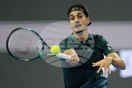 Alex De Minaur of Australia eyes the ball from Bu Yunchaokete of China in a men's singles match for the China Open tennis tournament in Beijing, China, Friday, Sept. 26, 2025. (AP Photo/Ng Han Guan)