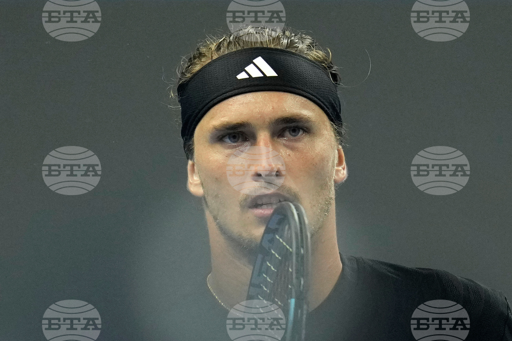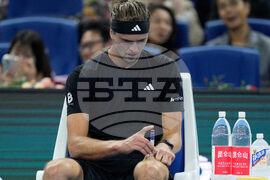 Alexander Zverev of Germany reacts during play against Lorenzo Sonego of Italy in a men's singles match for the China Open tennis tournament in Beijing, China, Friday, Sept. 26, 2025. (AP Photo/Ng Han Guan)