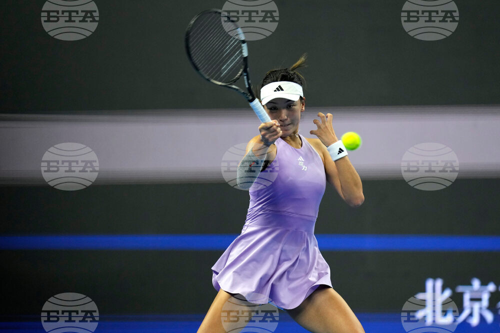 Wang Xinyu of China returns a shot from compatriot Zhang Shuai during a women's singles match for the China Open tennis tournament in Beijing, China, Friday, Sept. 26, 2025. (AP Photo/Ng Han Guan)