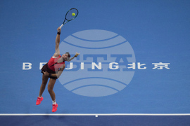 Elena Rybakina of Kazakhstan serves against Caty Mcnally of the United States in a women's singles match for the China Open tennis tournament in Beijing, China, Friday, Sept. 26, 2025. (AP Photo/Ng Han Guan)